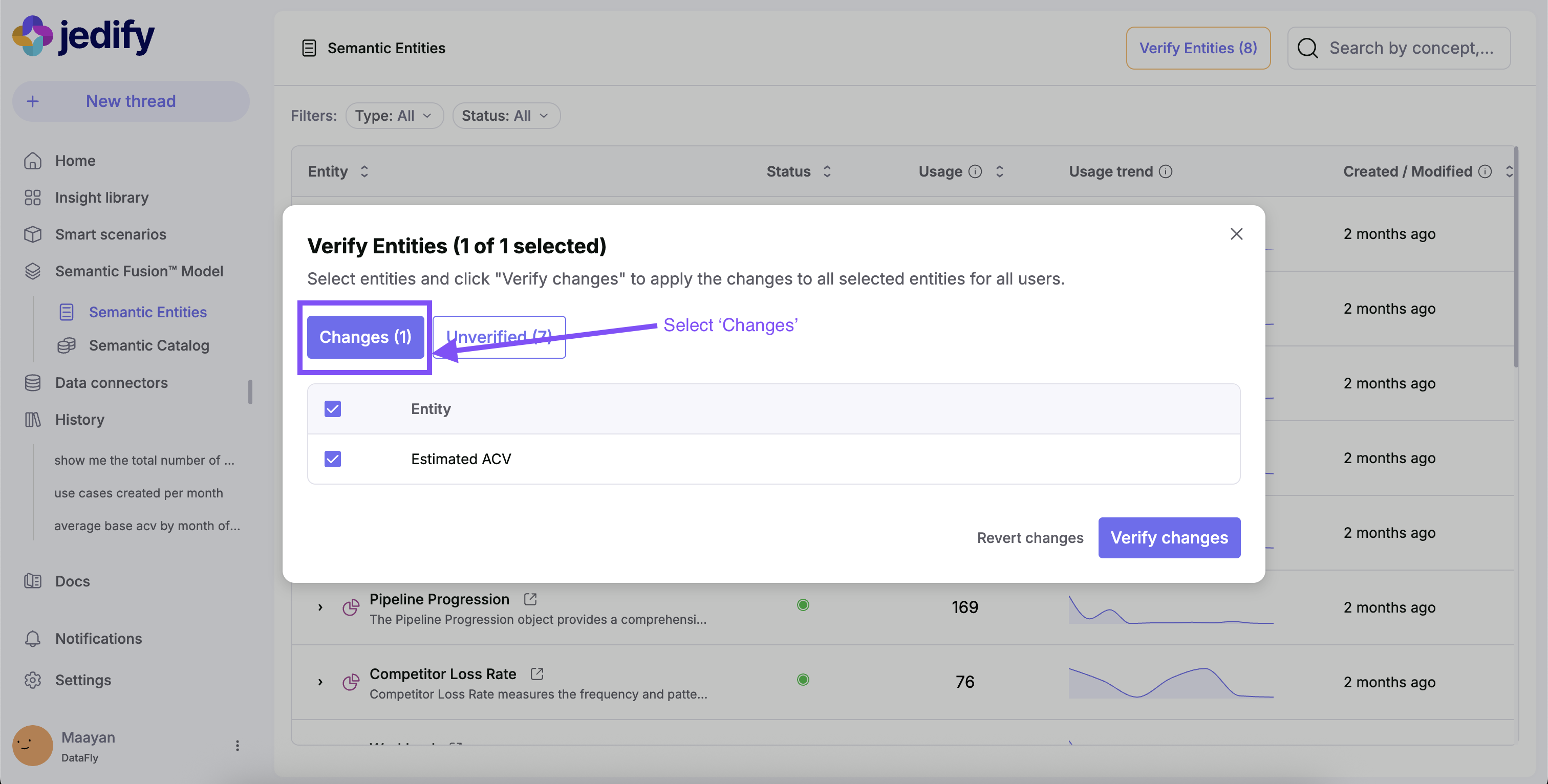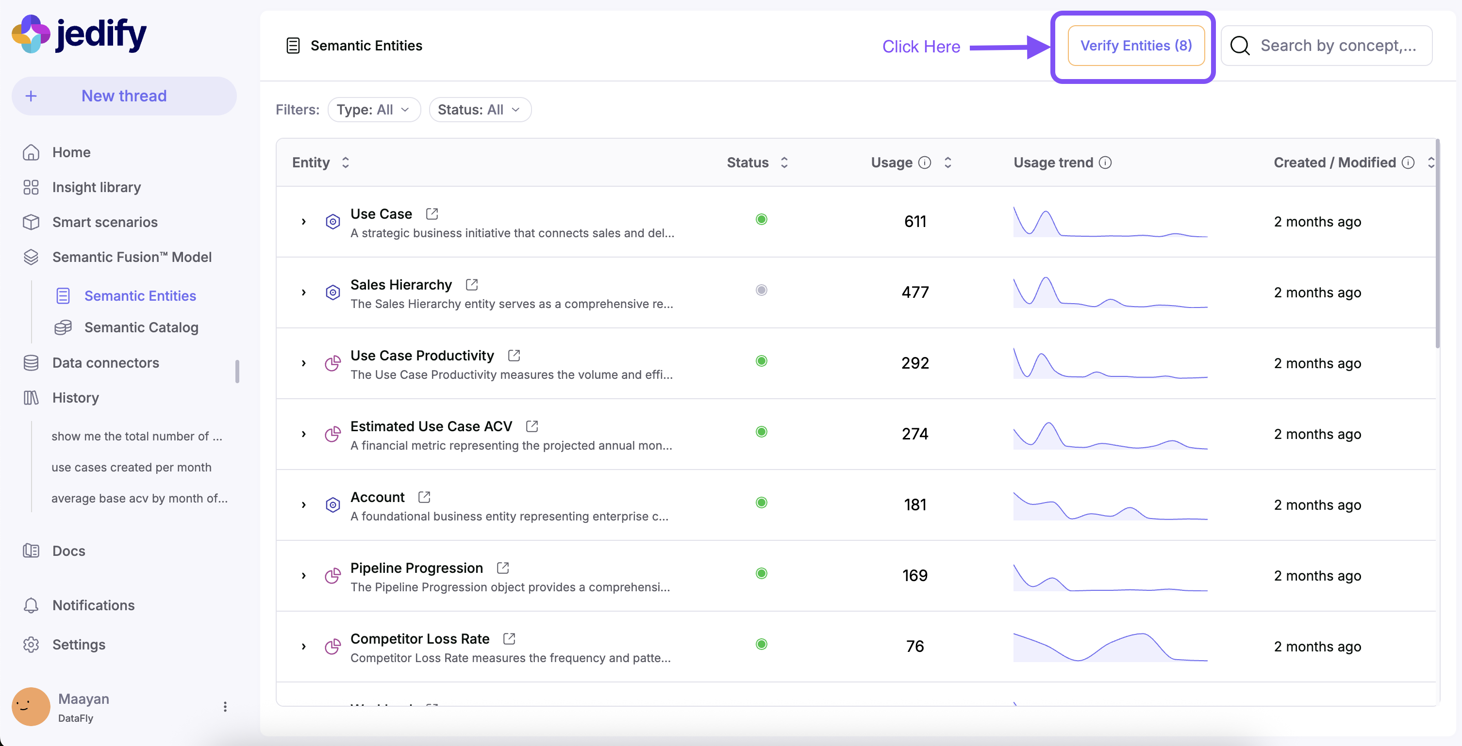- Business users can continue executing questions that rely on this entity and those will be executing the previously verified version of this entity.