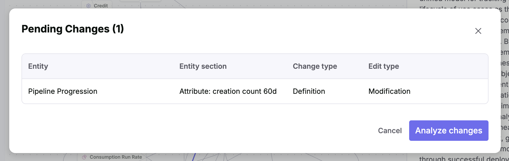 - After selecting ‘Analyze changes’, Jedify will perform an analysis of the changes made and assess any impact on related objects or components. For example, adding columns to the base query will trigger a creation of additional attributes within the entity.