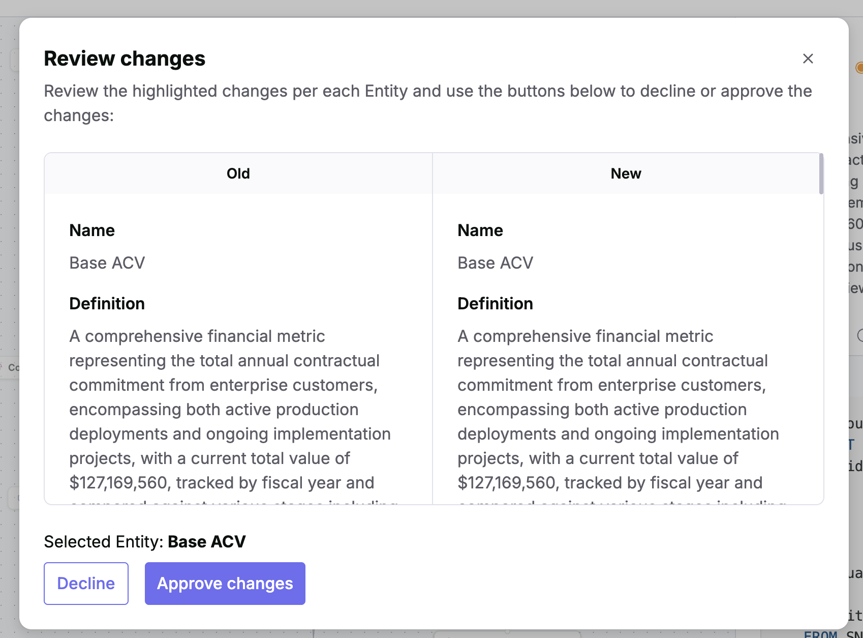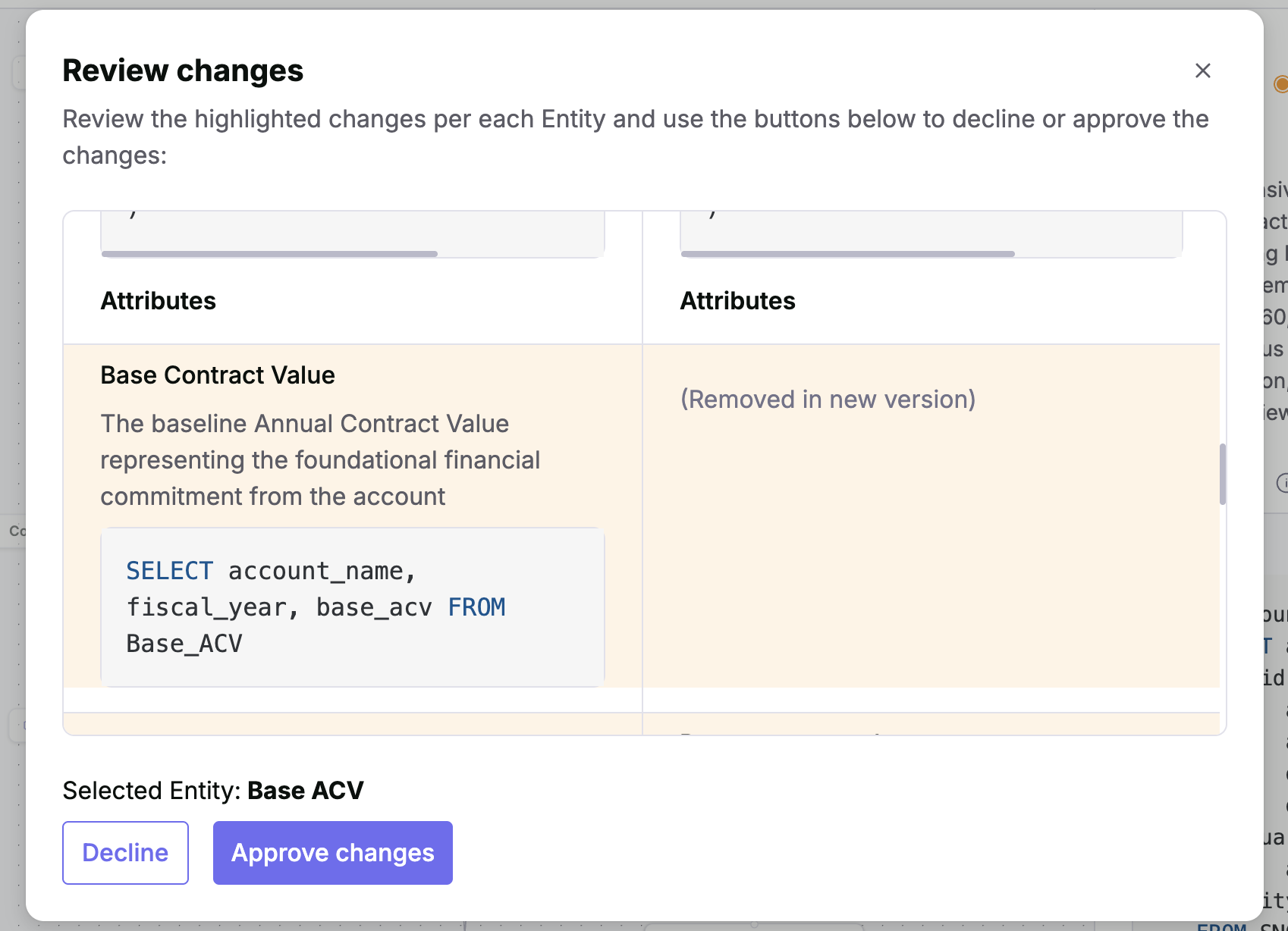 Review changes allows to compare between the previous and new version of the entity, highlighting the specific component within the entity that was revised as shown in the images below.
