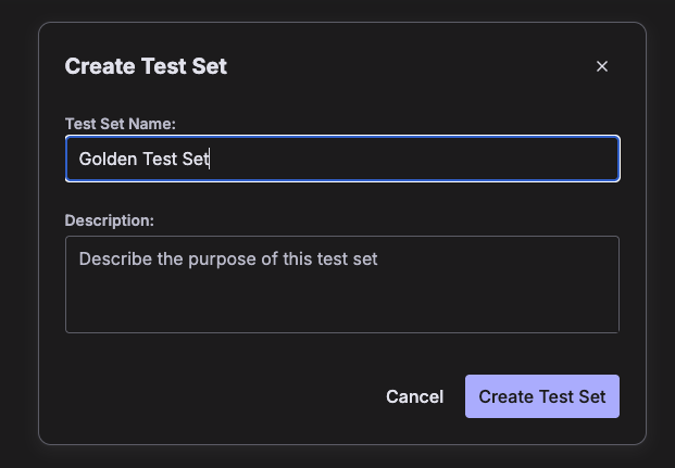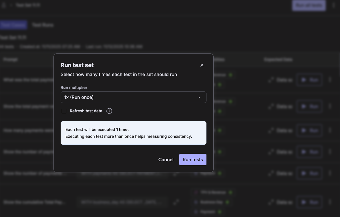 Once your set is populated, you can execute it on demand or on a schedule (coming soon).- Select the Test Set you wish to evaluate.